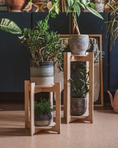Bodenständer mit Ablagen aus unbehandeltem Sperrholz.