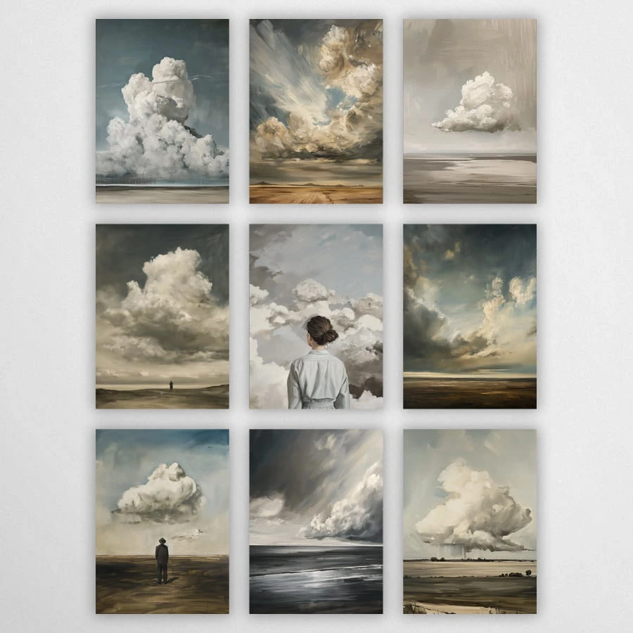 Ogólny nastrój grafik jest nostalgiczny i kontemplacyjny. Każda chmura i każda scena zdają się opowiadać swoją własną historię, tworząc bogatą narrację, która pozwala widzowi na chwilę ucieczki w świat cichej kontemplacji. Wspólny motyw chmur, będących symbolem przemijania i ciągłego ruchu, wzmacnia wrażenie, że prace te dotyczą nie tylko piękna natury, ale również ulotności czasu i refleksji nad przemijaniem.