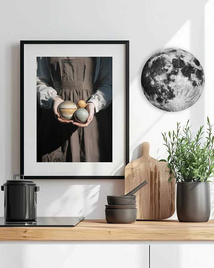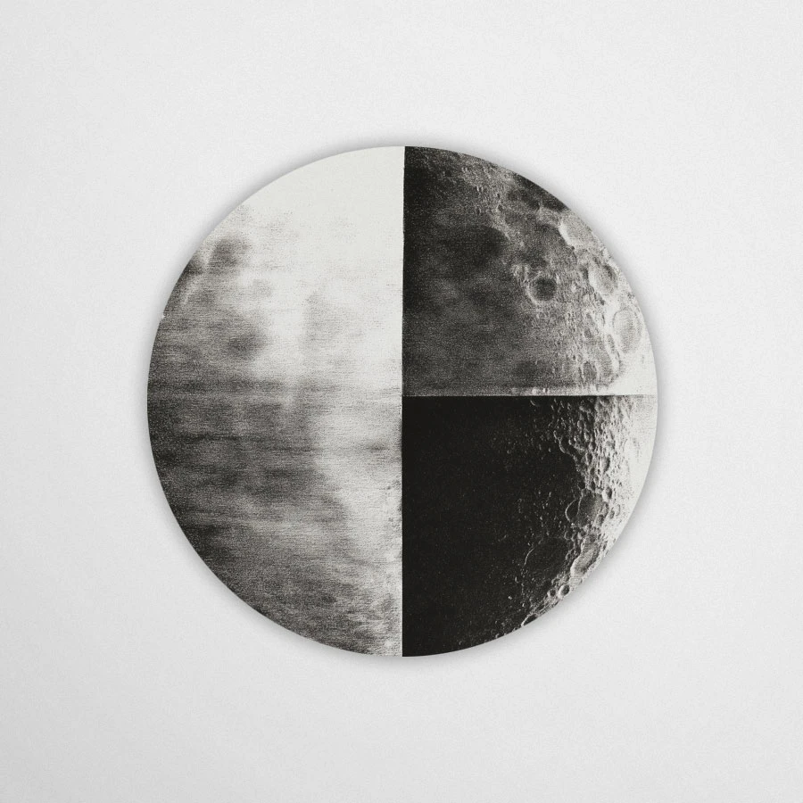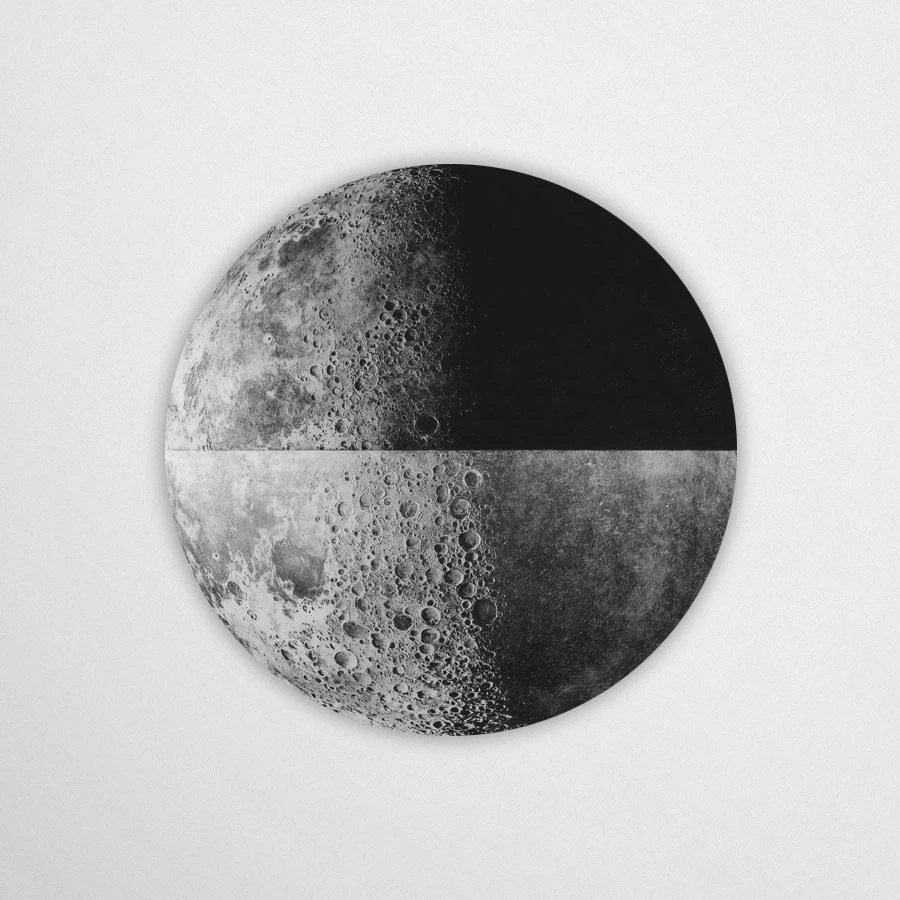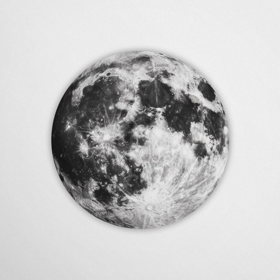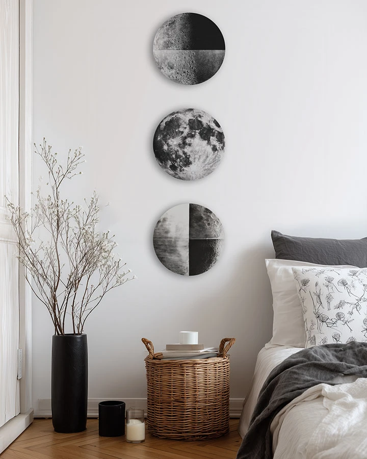 Ta okrągła dekoracja to artystyczna interpretacja Księżyca – nie dosłowna fotografia, ale wizja inspirowana jego fakturą, światłem i tajemnicą. Subtelne kontrasty czerni, bieli i szarości przywołują wrażenie nocnego nieba, jednocześnie nadając całości graficzny, niemal malarski charakter.