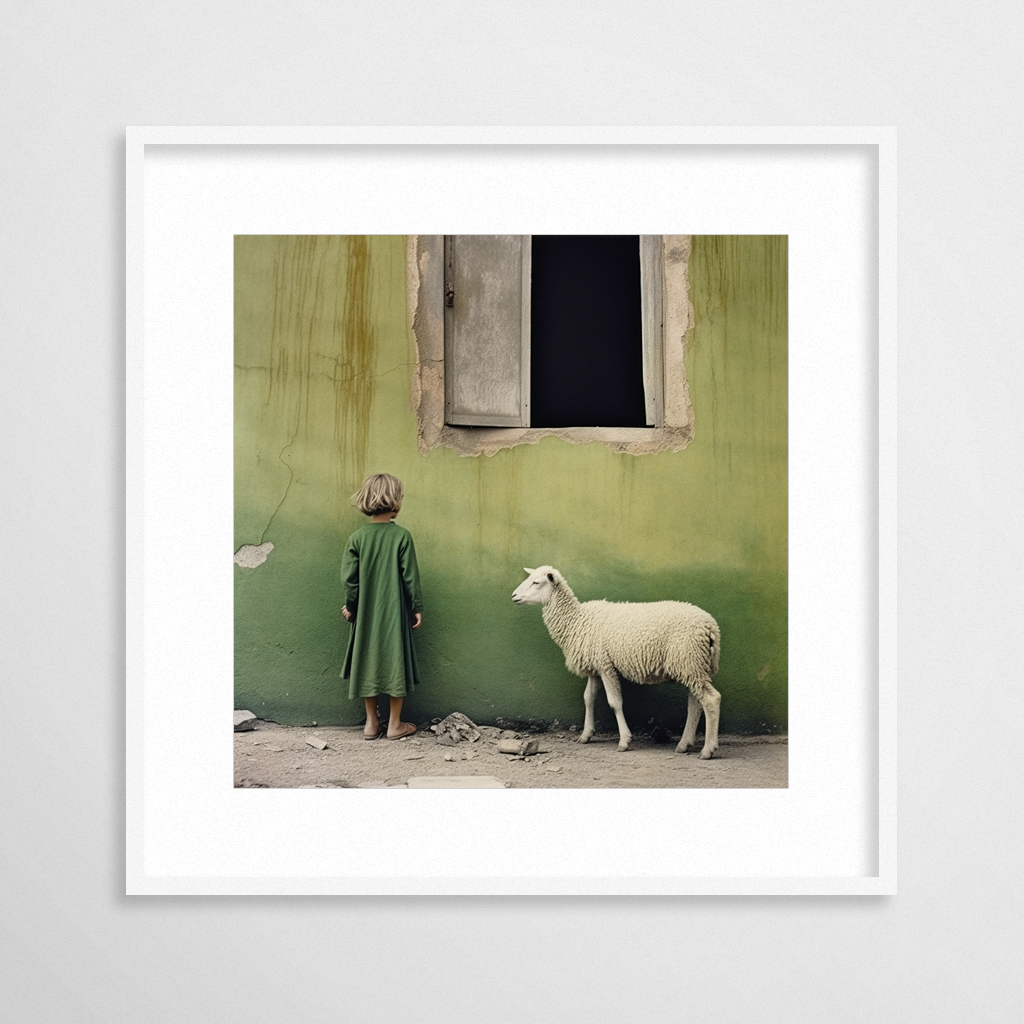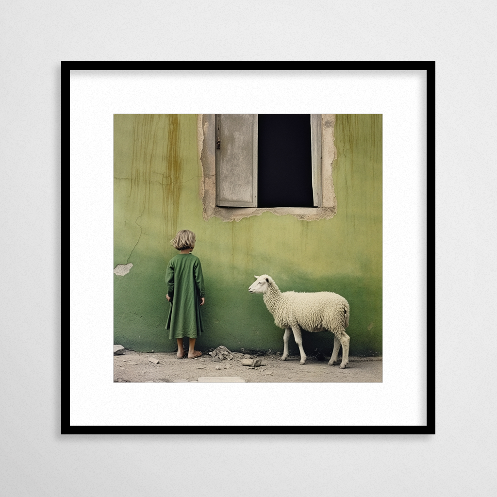 Plakat „Zieleni” to coś więcej niż tylko dekoracja. To zatrzymana w kadrze chwila, która emanuje niezwykłym spokojem i nostalgią. Praca przedstawia postać w szmaragdowej sukni, stojącą ramię w ramię z białą owieczką na tle wiekowej, teksturowanej ściany. Ten obraz to pochwała prostoty, powolnego życia i głębokiej, niemal pierwotnej więzi między człowiekiem a naturą.