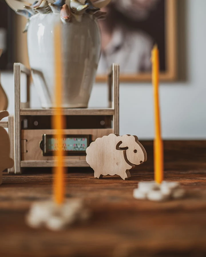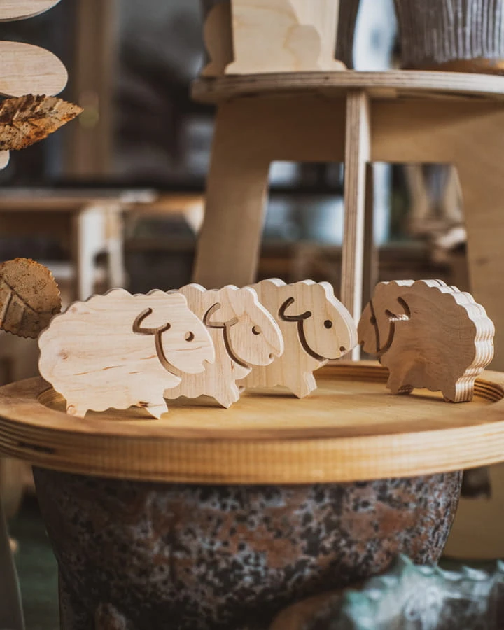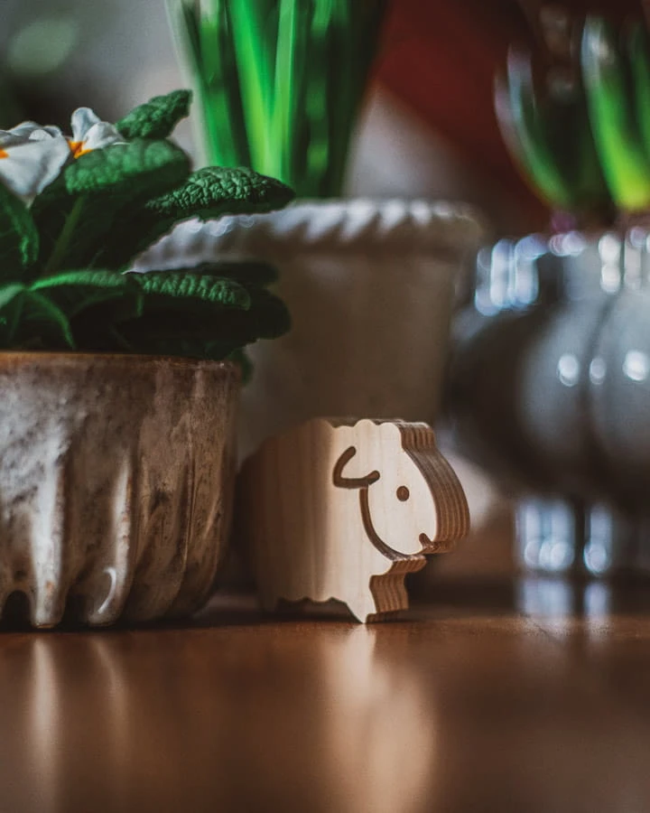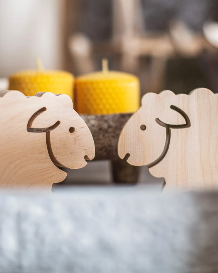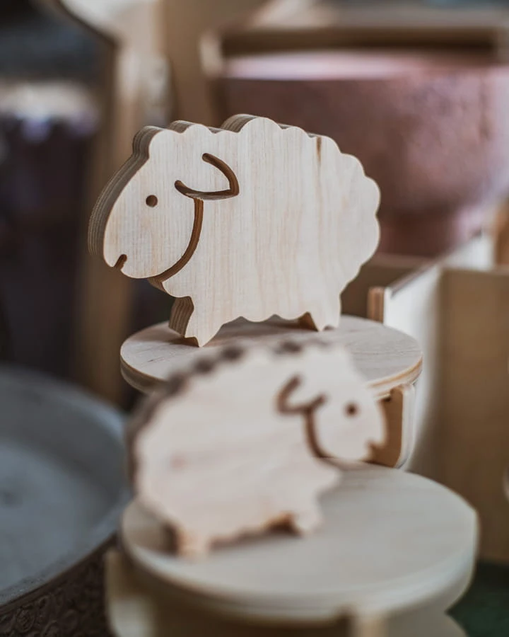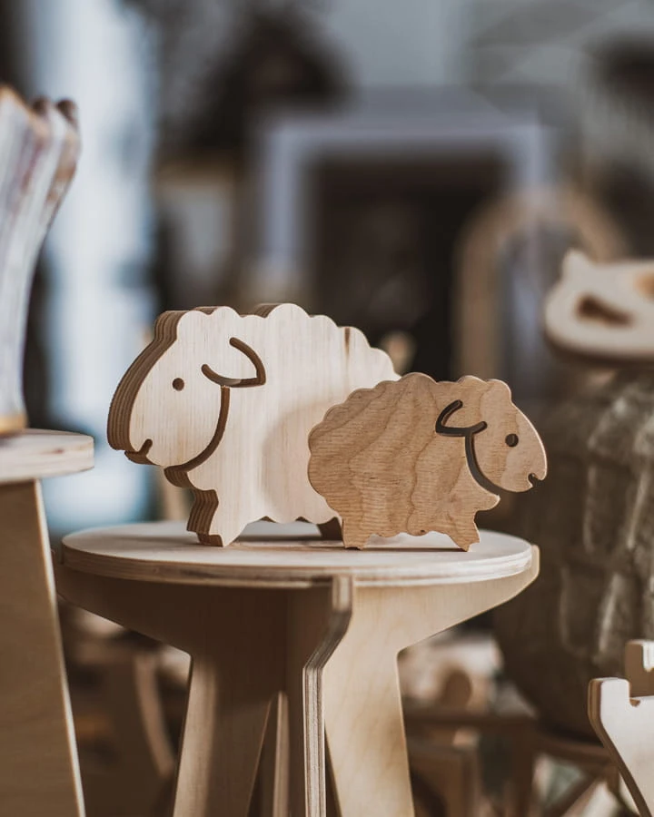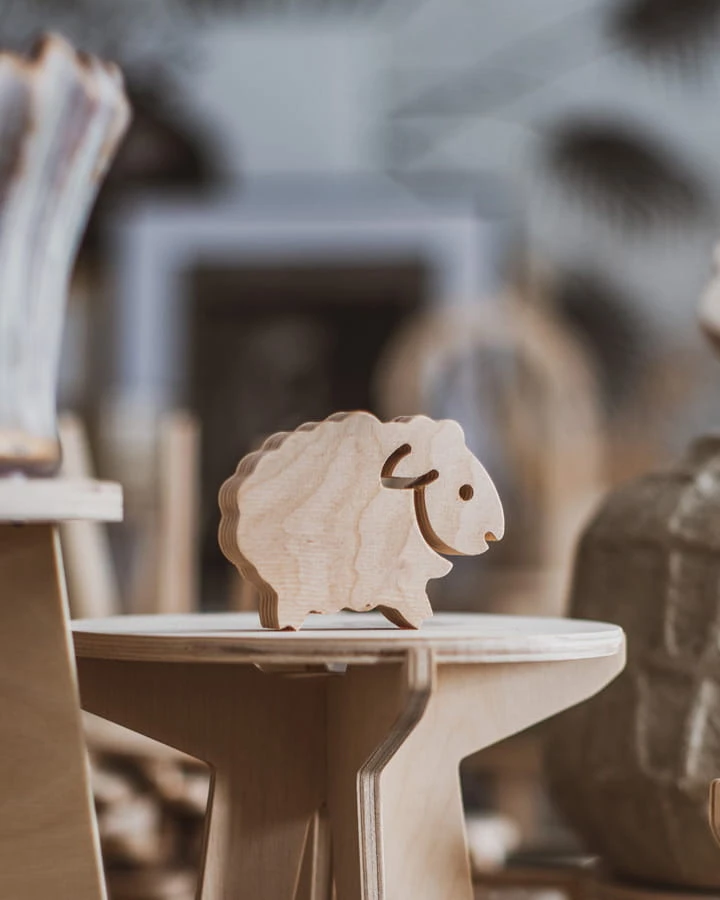 Baranek o imieniu Bernard wycięty z surowej sklejki. Dostępny w dwóch rozmiarach.