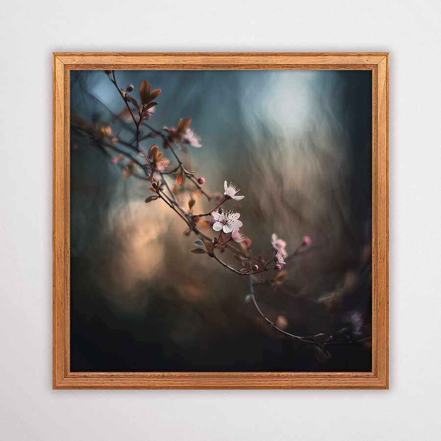 Plakat botaniczny Botaniczne Atelier 1 to kwintesencja elegancji i nowoczesnego podejścia do klasycznych motywów roślinnych. Ta wyjątkowa dekoracja ścienna przedstawia subtelną, kwitnącą gałązkę, której niemal przezroczyste płatki tworzą fascynujący kontrast z głębokim, nastrojowym tłem. Jest to idealny przykład stylu moody botanicals, który od kilku sezonów dominuje w najbardziej prestiżowych katalogach wnętrzarskich. Dzięki zastosowaniu artystycznego rozmycia (bokeh) oraz precyzyjnemu operowaniu światłem, obraz nabiera niesamowitej głębi, stając się centralnym punktem każdego pomieszczenia.