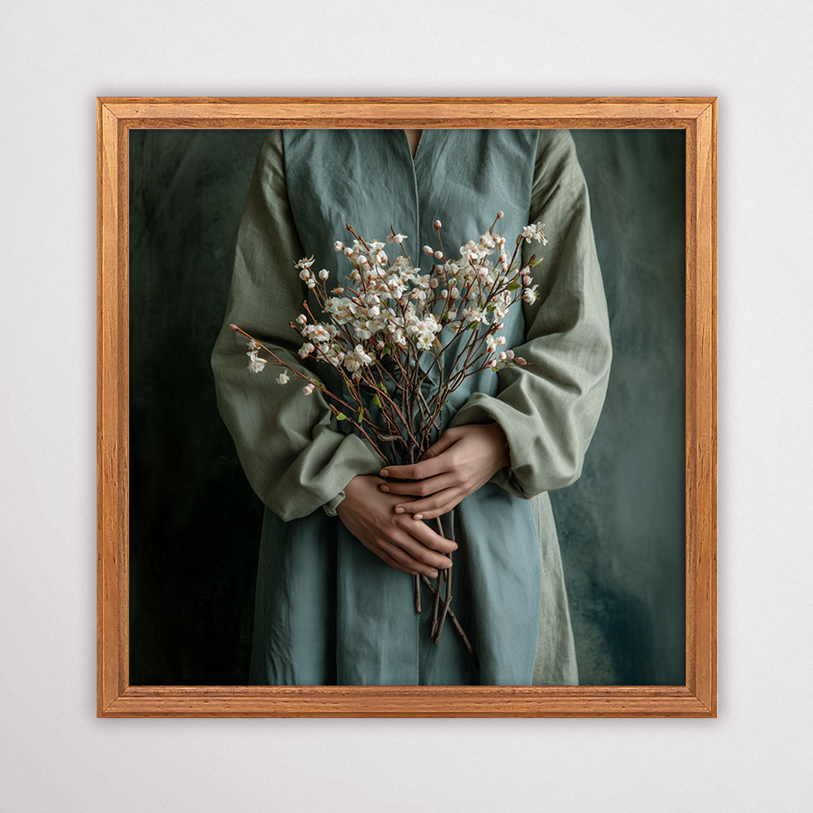 Delikatność Trwania 1 to plakat z kwiatami, który celebruje piękno codziennych chwil i bliskość z naturą. Artystyczne ujęcie przedstawia dłonie trzymające obfity bukiet kwitnących gałązek na tle lnianej sukni. Ta rustykalna dekoracja ścienna emanuje ciepłem, autentycznością i sielskim klimatem, który natychmiast przywodzi na myśl lato na wsi. Jest to idealna propozycja dla osób, które pragną wprowadzić do swoich wnętrz więcej przytulności i naturalnego uroku w stylu vintage lub farmhouse.