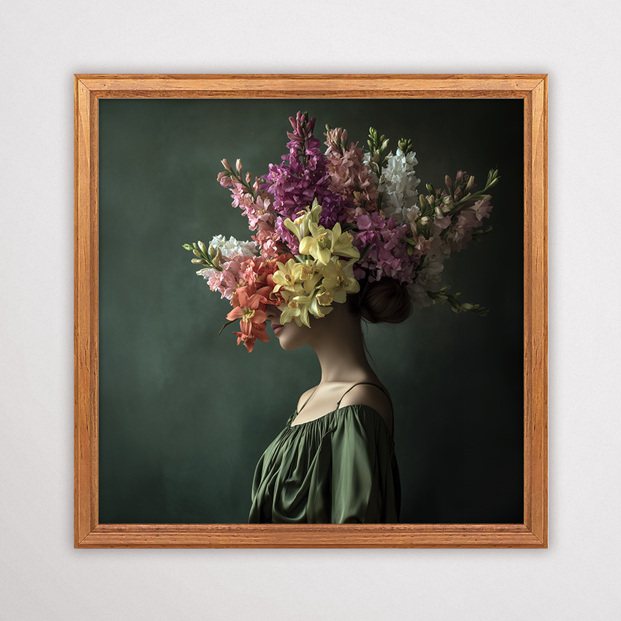 Plakat botaniczny Delikatność Trwania 3 to eksplozja barw i kreatywności zamknięta w jednej, zachwycającej grafice. Obraz przedstawia profil postaci w zielonej szacie, z której wyrasta oszałamiający, wielokolorowy bukiet letnich kwiatów – od fioletowych gladioli po delikatne, różowe maki. To artystyczne ujęcie to hołd dla płodności natury i ludzkiej wyobraźni. Dzięki zastosowaniu głębokiego, ciemnozielonego tła, kolory kwiatów wydają się jeszcze bardziej intensywne i żywe, co sprawia, że ten nowoczesny plakat na ścianę dosłownie tętni energią.