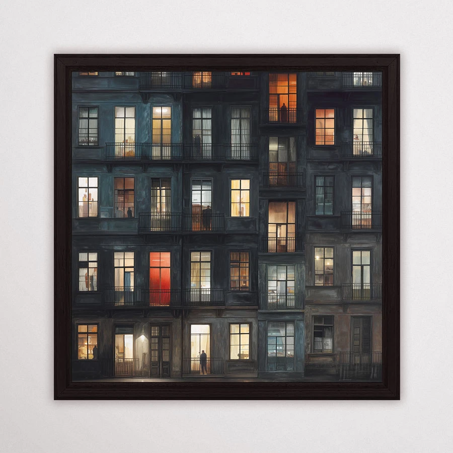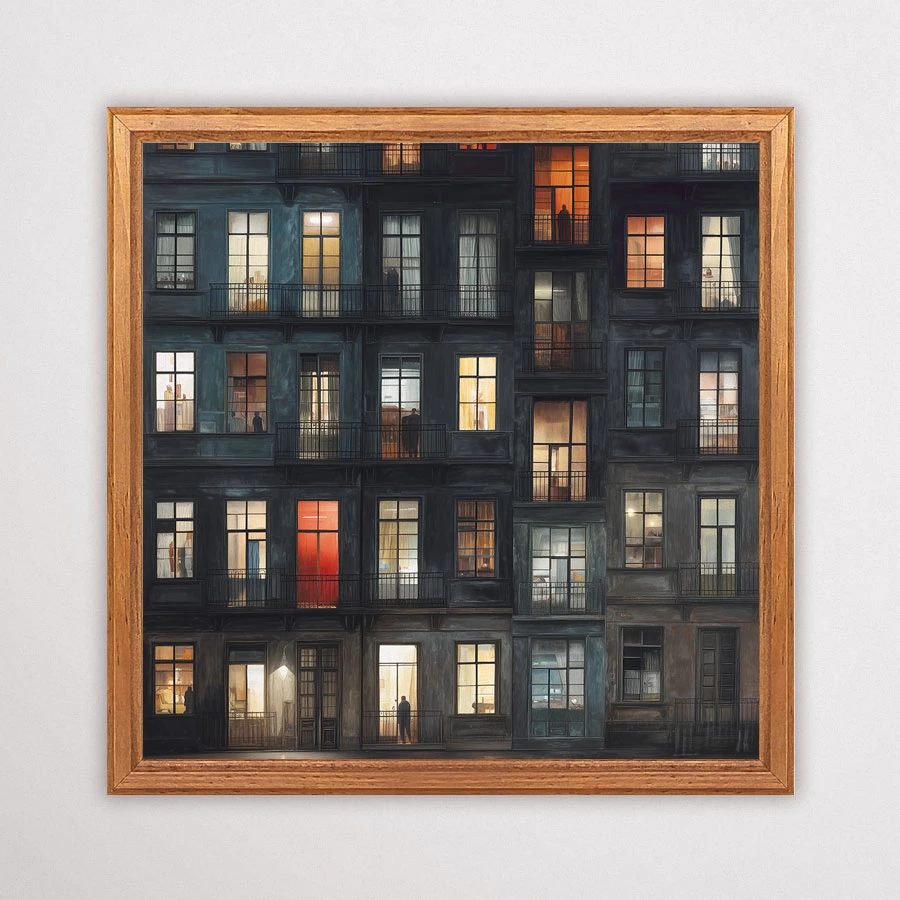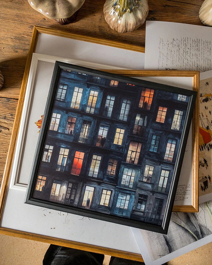 Dekoracja ścienna formatu 27x27 cm - rama drewniana (czarna lub biała), plakat 25x25 cm. Całość zabezpieczona szkłem akrylowym.