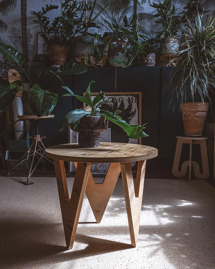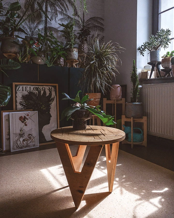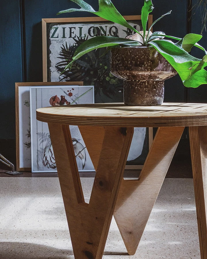 Lekki stolik kawowy wykonany ze sklejki. Całość powierzchni blatu i nóg została zaimpregnowana chroniąc stolik przed działaniem wody.