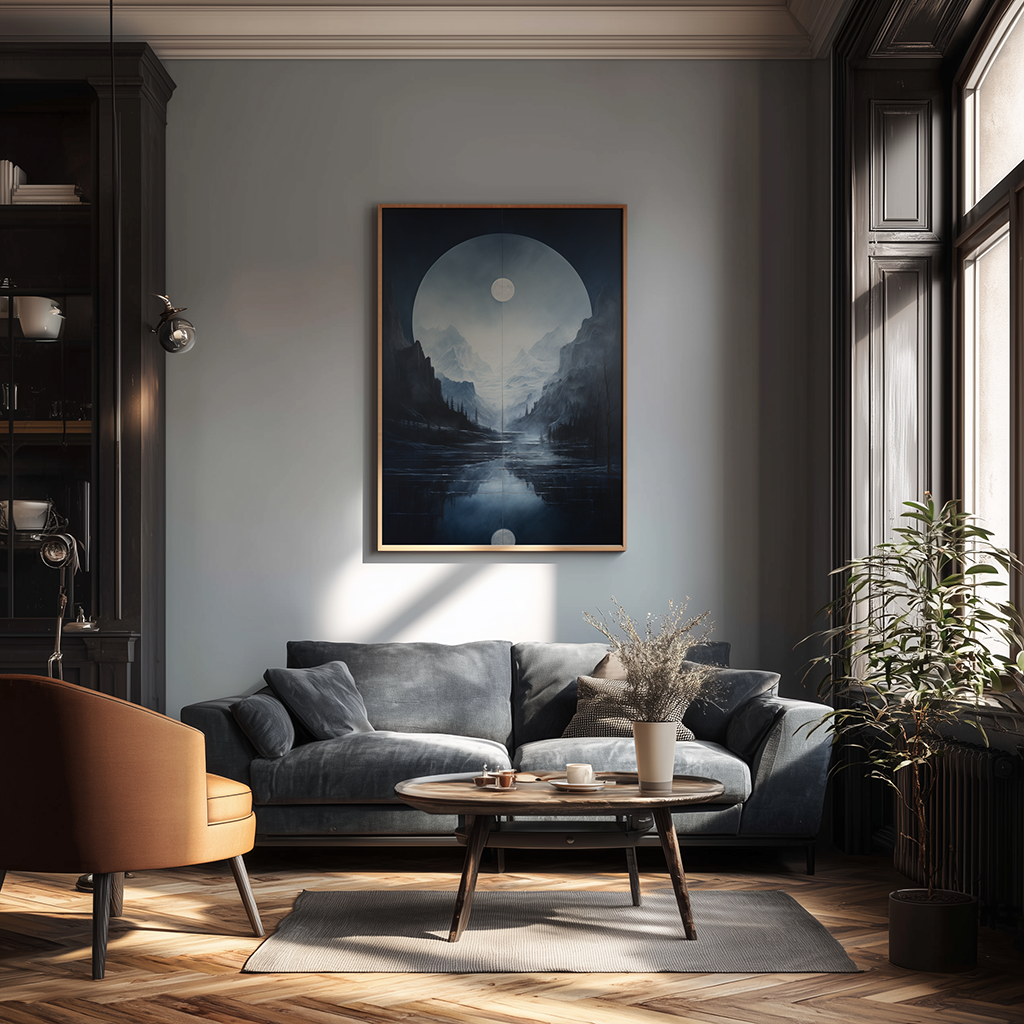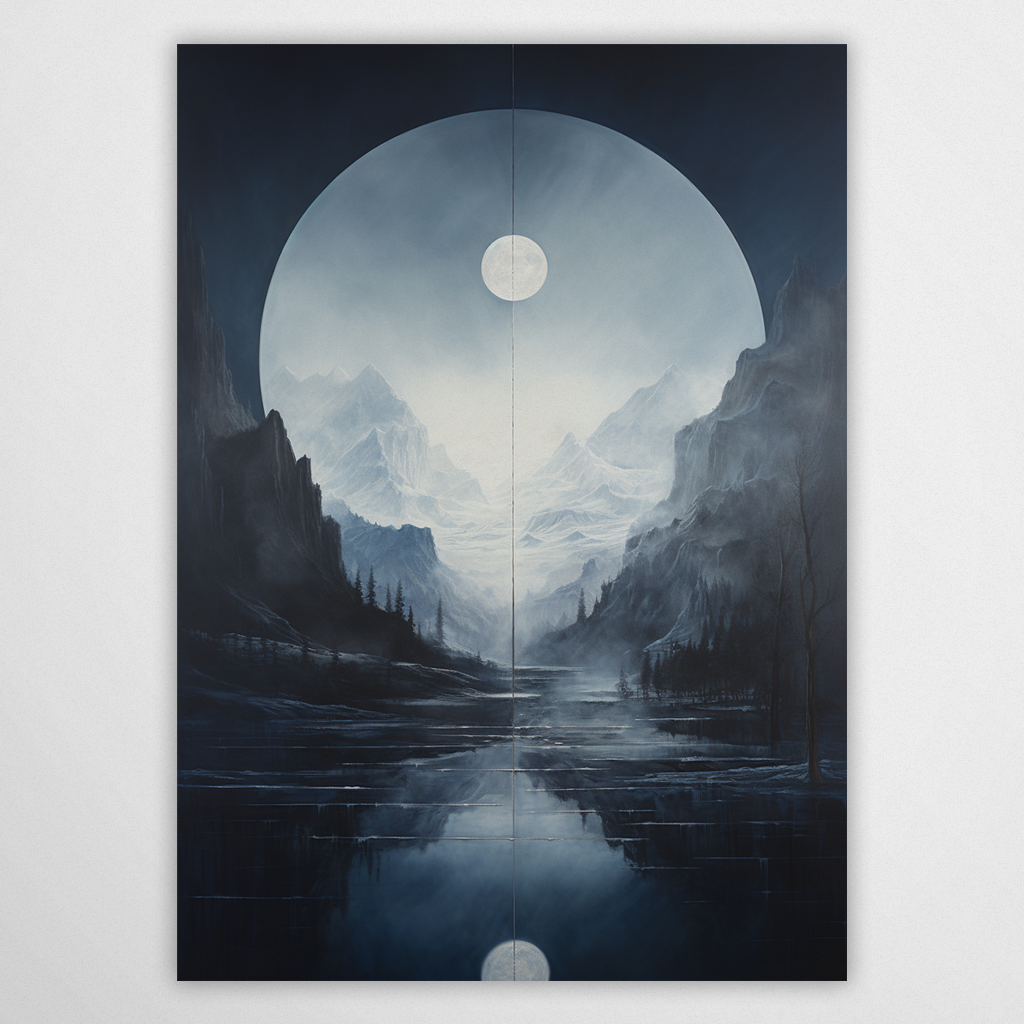 Ten plakat to studium symetrii i mistycyzmu, przedstawiające oniryczny krajobraz górski, w którym granica między rzeczywistością a odbiciem zostaje całkowicie zatarta. Grafika została utrzymana w chłodnej, niemal monochromatycznej tonacji, zdominowanej przez głębokie odcienie granatu, indygo oraz stalowe szarości, co nadaje kompozycji surowy, a jednocześnie uspokajający charakter. Centralnym elementem wizualnym jest tarcza księżyca, która znajduje swoje idealne, geometryczne powtórzenie w dolnej części obrazu, sugerując obecność krystalicznie czystej, nieruchomej tafli jeziora.