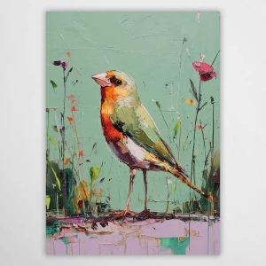Ten plakat premium charakteryzuje się przemyślaną paletą barw, która idealnie wpasowuje się w trendy nowoczesnego designu. Tło w stonowanym odcieniu jasnej, miętowej zieleni tworzy spokojną bazę, na której wyróżnia się bogato nasycona sylwetka szczygła. Ptak, z charakterystycznym czerwono-pomarańczowym licem, zielono-brązowym grzbietem i białym brzuchem, jest otoczony dynamicznymi, malarskimi akcentami dzikich kwiatów i traw, w tym subtelnie zarysowanym makiem. To sprawia, że jest to doskonały plakat do kolorowych wnętrz.