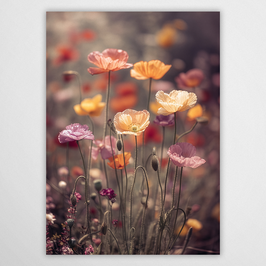 Plakat botaniczny „Szepty Polne I” to unikalna dekoracja ścienna, która idealnie wpisuje się w najnowsze trendy aranżacji wnętrz. Ta artystyczna fotografia przedstawia polne maki w rzadko spotykanych, pastelowych odcieniach liliowego różu i ciepłej brzoskwini, stanowiąc doskonałą alternatywę dla klasycznej grafiki z kwiatami. Dzięki zastosowaniu profesjonalnego efektu bokeh (rozmytego tła), obraz zyskuje oniryczny, lekki charakter, który optycznie powiększa przestrzeń i wprowadza do pomieszczenia atmosferę spokoju. To sprawdzony wybór do salonu w stylu boho lub nowoczesnej sypialni, gdzie dominują naturalne materiały i stonowana kolorystyka.