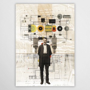 W odróżnieniu od klasycznych portretów, ta grafika na ścianę prezentuje Teslę jako architekta nowoczesnego świata. Postać naukowca została zestawiona ze skomplikowaną siecią schematów elektrycznych, cewek i generatorów, które zdają się tworzyć nad jego głową aureolę z innowacji. Wykorzystanie technicznych rysunków, geometrycznych akcentów w odcieniach żółci i pomarańczu oraz tekstur przypominających stare patenty nadaje projektowi unikalny, industrialny charakter.